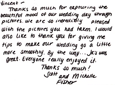 HI VINCE ! It is Todd and Melissa Camp from OHIO!!! Hope all is well. You popped in my mind today so I just needed to get in touch. We are always saying" we will do this or that the next time we get married". We are looking to do it again in about 2 years. Can you believe it is already going to be 3 years!!!??? WOW, what a great time it has been. I quit my teaching job and am now a full time artist. I love it! Melissa changed jobs also. She is working for the dominican sisters! She is the administrator of their eco-based farm. They have organic gardens, animals, and 160 acres of land. I hope business is going well, we thought of you two after the last big storm hit there. Talk with you soon....peace.